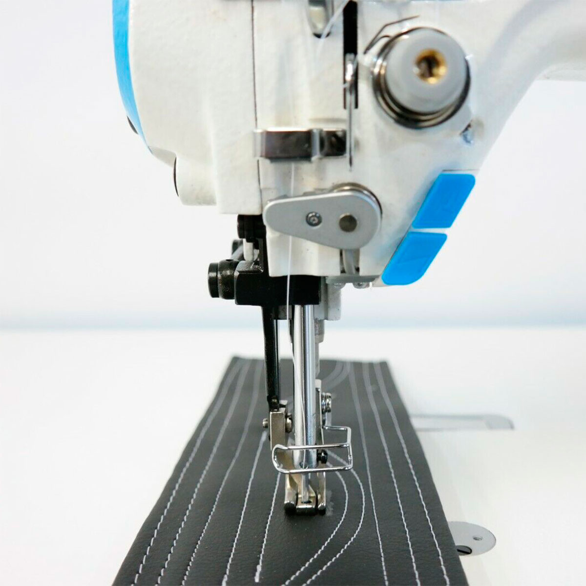1 needle lockstitch machine designed for sewing thicker materials (e.g. leather, upholstery materials), equipped with an energy-saving motor integrated directly into the machine head (Direct Drive system). This solution ensures quiet operation and low energy consumption.