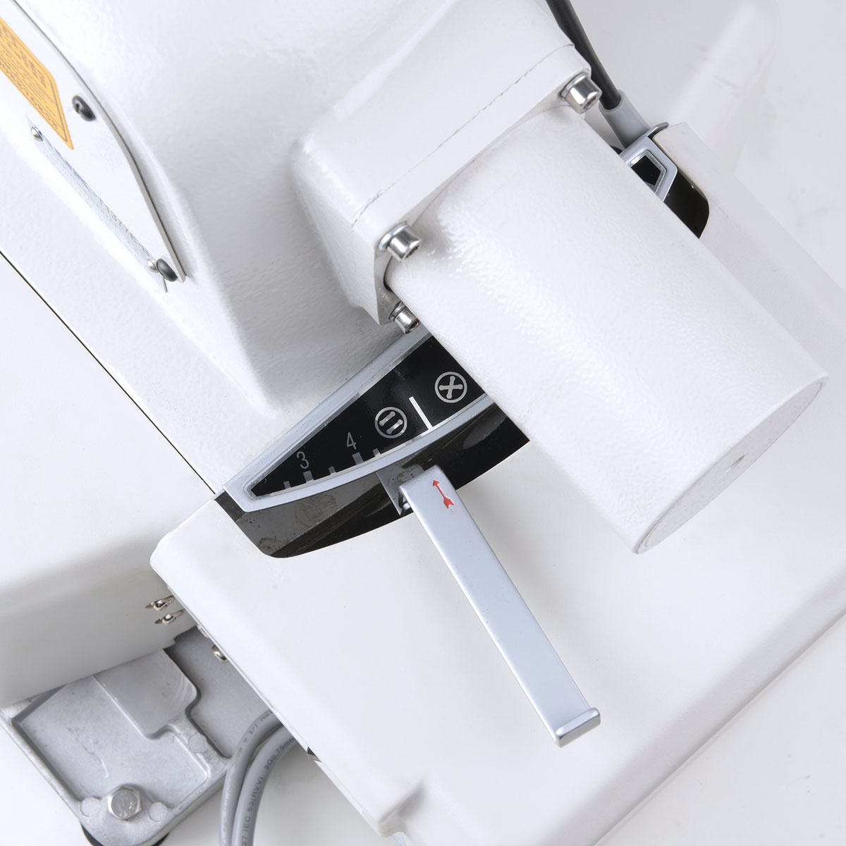 The stitch shape (for buttons with 4 holes) can be quickly changed between parallel or "cross", without changing the cams. The stitch type is changed by means of the lever on the machine head.