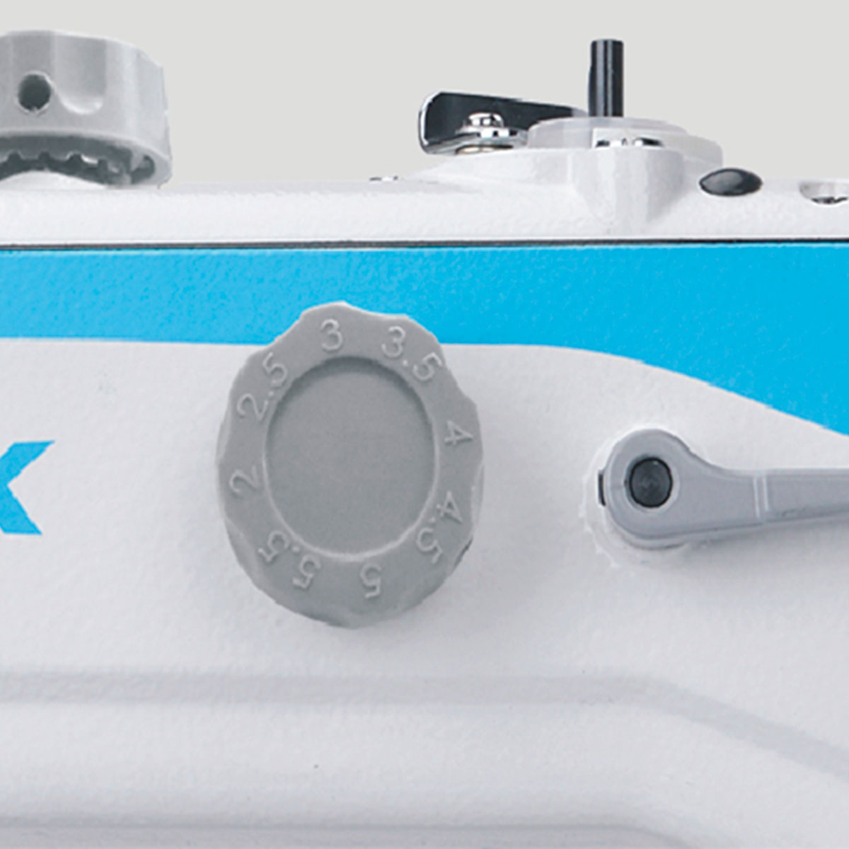 Outer and inner foot pressure adjustment maintains the perfect stitch appearance regardless of material thickness.