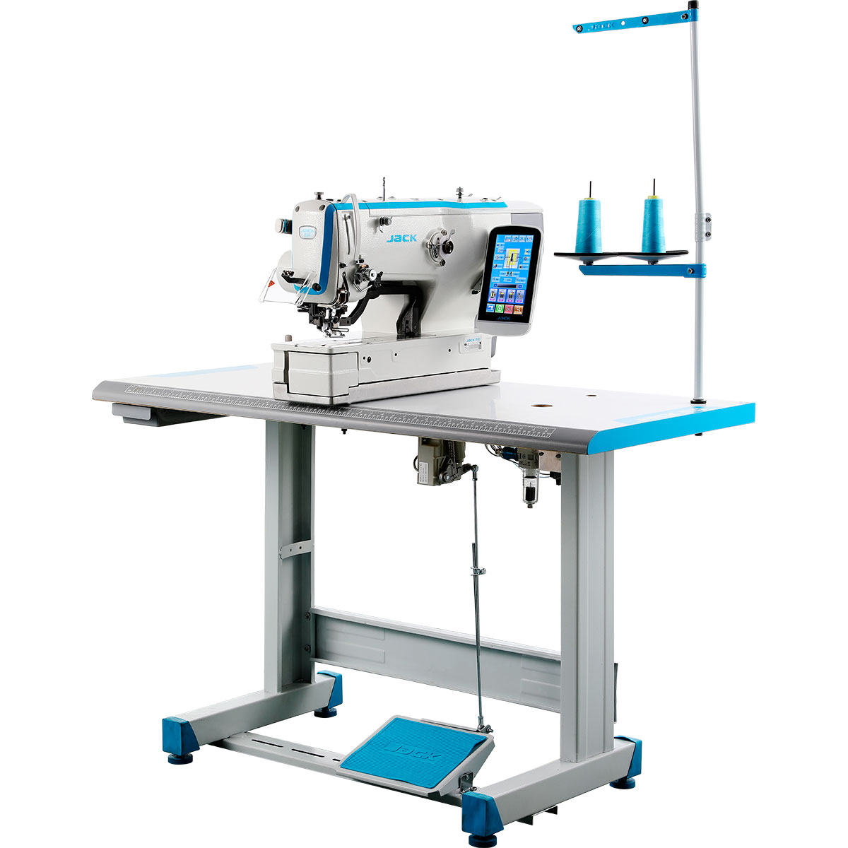 Semi-dry head to ensure clean seams. Multiple cutting function, different types of buttonholes available. Cooling system for longer machine life.